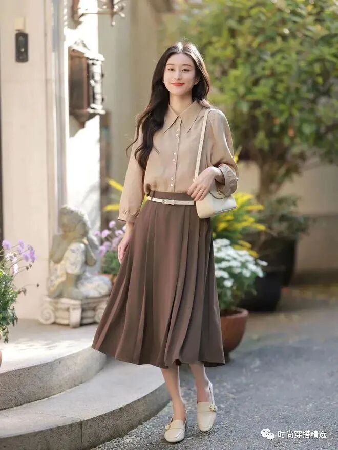 当阳光明媚时,杏色衬衫在风中轻盈。翻领设计勾勒出优雅的曲线,像花瓣一样绽放。搭配焦糖色超短裙,就像夕阳的余晖洒在地上。清新与温柔交织在阳光下,给人一种宁静与温暖的感觉。