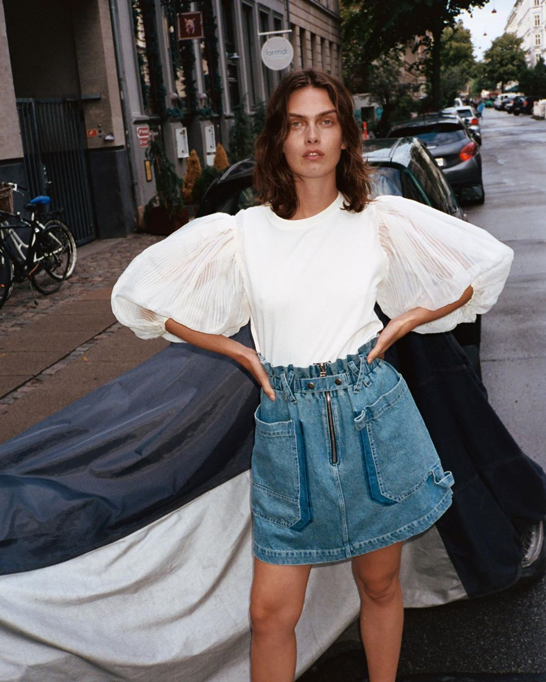 宫廷风泡泡袖+牛仔裙,简单又Chic,充满了慵懒的少女气息。浅色的单宁材质与透视效果的泡泡袖上衣形成了鲜明有层次的对比,显得精致又毫不刻意。instagram @ganni
