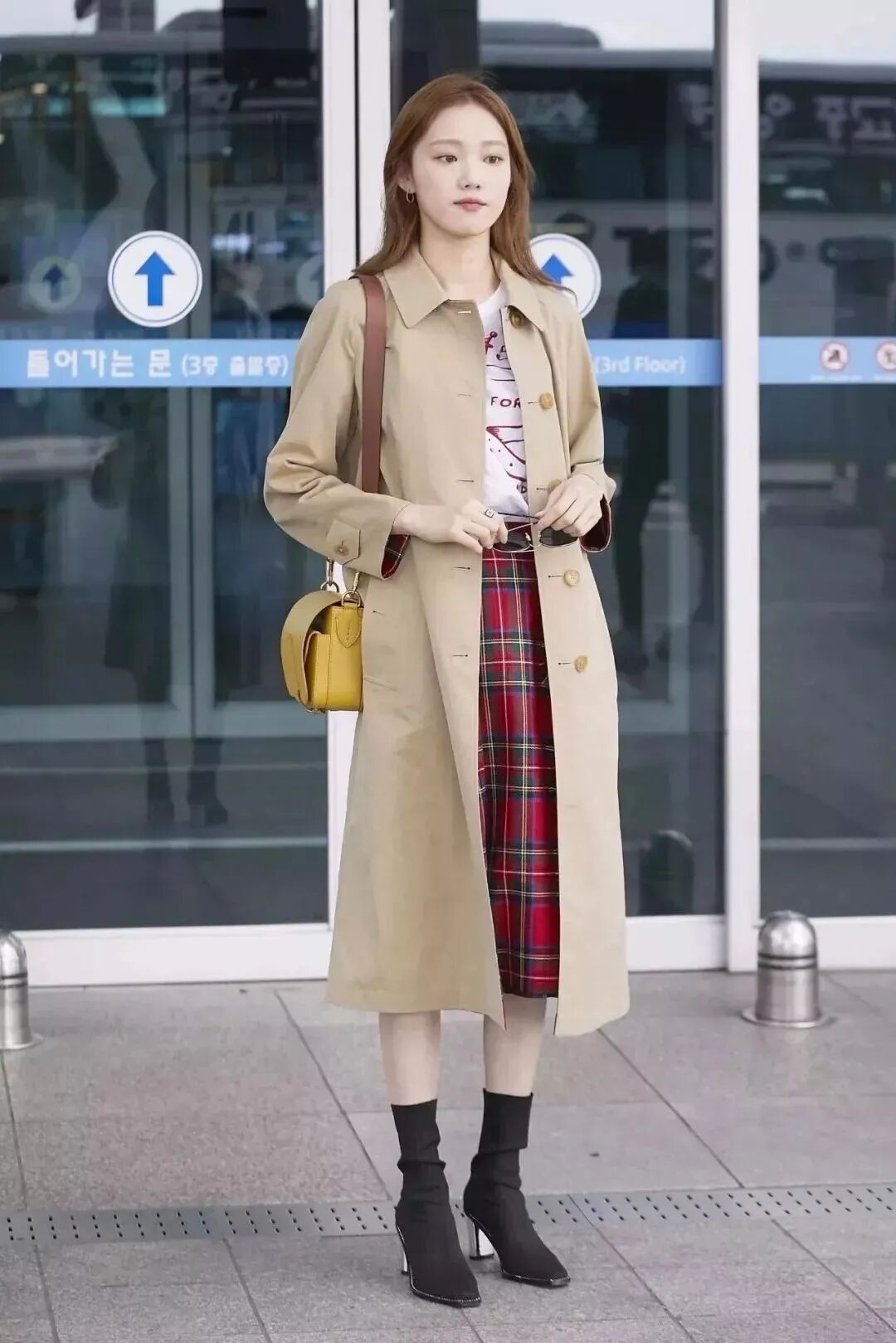 时髦精们一定要pick风衣+裙子的组合!像朴敏英欧尼这样用深色系风衣搭配黑色包臀裙和白T,越是简单越是大气优雅。