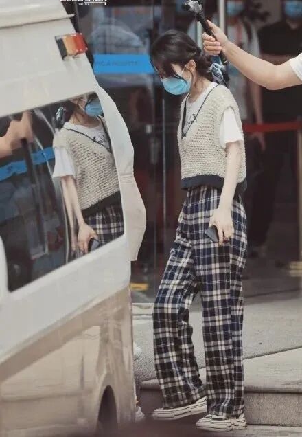 米色针织背心内搭白色印花T恤,搭配藏蓝米白高腰格子长裤,长发松松绾起,怎么看都是温婉的学院风学姐。