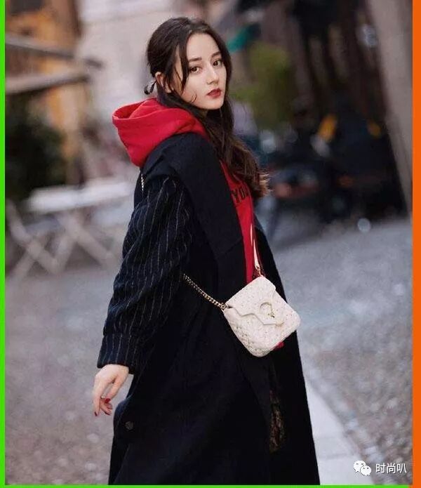 条纹的黑色大衣和连帽的红色卫衣组合,颜色一深一浅显得很有视觉上的说服力,正好将黑色的大衣和高饱和度的红色融合,所以会显得更有气质。
