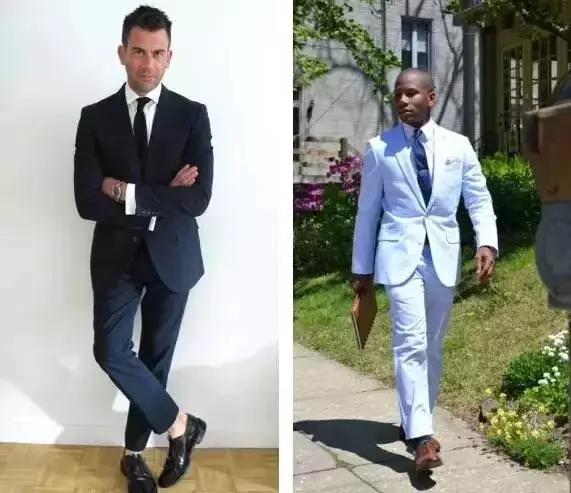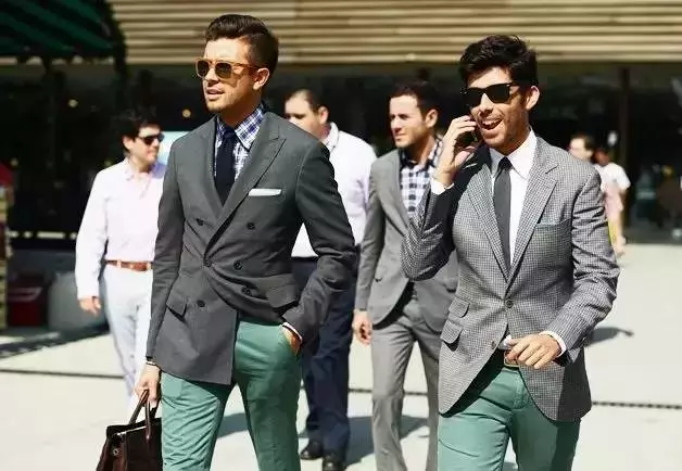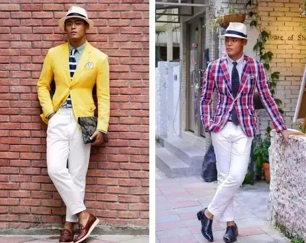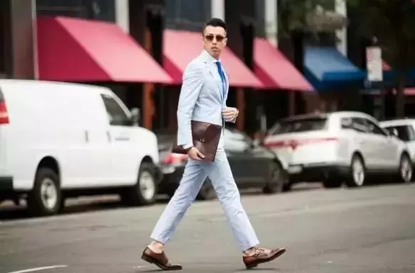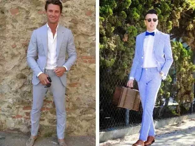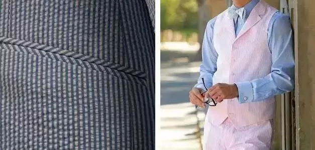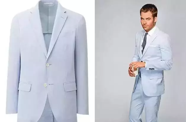 ↑常见的泡泡纱通常会是浅蓝、绿、灰或是大地色所组成,但往事总会有例外,比如看不太出来左边那件居然也是泡泡纱制成的西装。搭配上的话你只需要当作它是一件更休闲的浅色西装,搭上平时“夏天”会搭的样子即可。