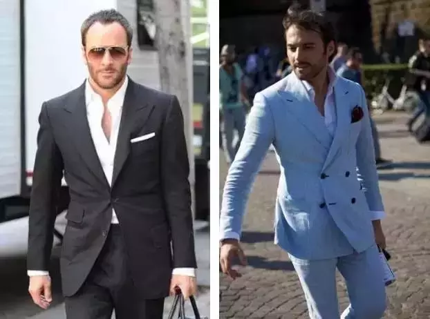 ↑露出胸膛一直是Tom Ford(左边)的招牌,他就是不爱打领带,但有些人总会觉得没领带怪怪的。你希望不打领带这件事情更自然一些吗?那穿得像右图会是一个好的方案。