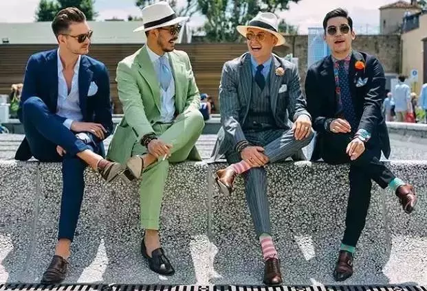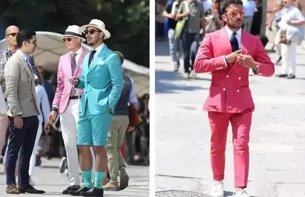 ↑鲜艳的配色绝对是最佳解,也许看久了你会欣赏到中间那位老先生的细节、粉红裤子仁兄的配色、或是最右边游刃有余的西装穿法,但第一眼一定会先看到全身红的这位先生。