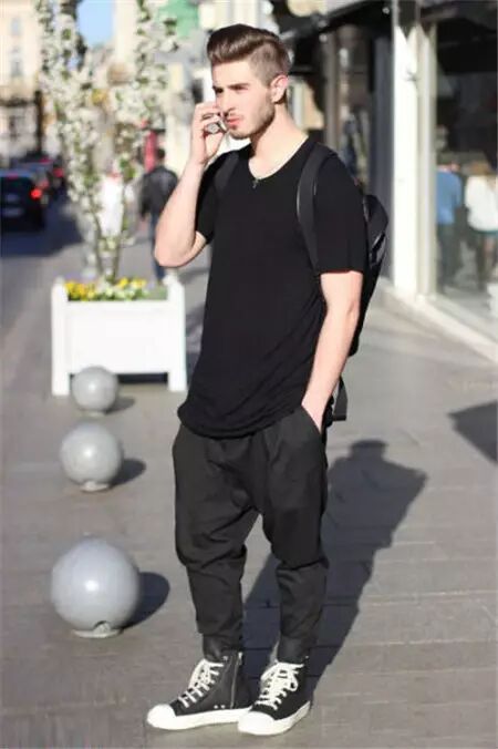 夏日里,着装上都沉静于五彩斑斓的世界,只有对自己的身材不够自信的胖子,依然选择黑色,YES!非常正确。黑色是显瘦、显型的利器,对满身肉肉的男士来讲这是必选的着装色彩。简洁的黑色T恤搭配同色哈伦裤子,即遮挡了赘肉又能彰显时尚有型,何乐而不为!