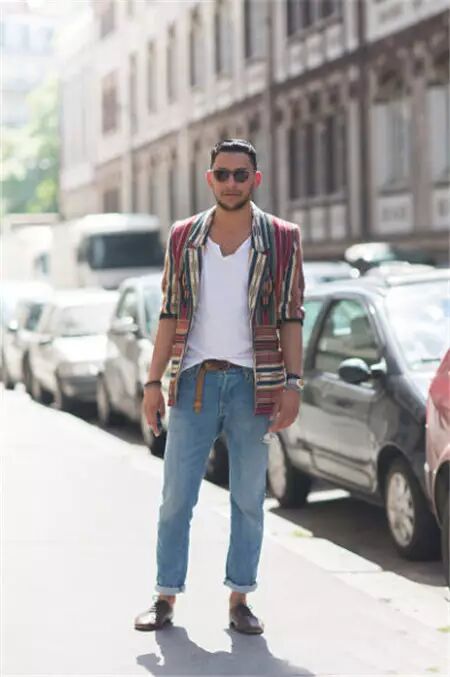 想要出挑,还得在图案上下功夫。浮躁夸张的图案不适合稳重大气又儒雅的男士,条纹的印花元素才是首选。选择规矩又有个性的印花方式T恤搭配基本款短裤,再选择一条亮色腰带装点气质,这样绝对让你与众不同。