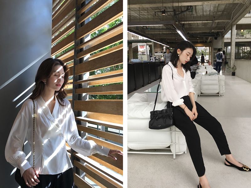 纯白衬衫是最不容易过时的款式,但是小仙女也要注意不要选过于职业的领口,版型宽松,更好搭配。