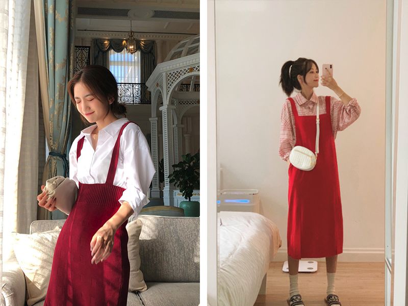 衬衫+背带裤特别减龄,尤其是亮色款,内搭衬衫最好是白色,更衬肤色。