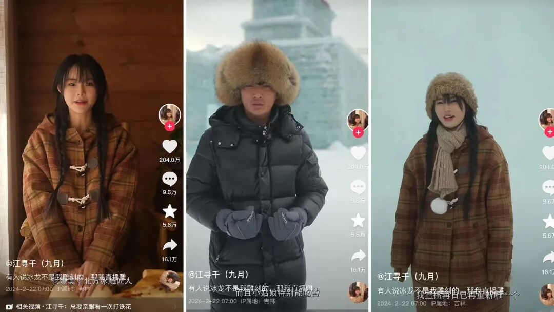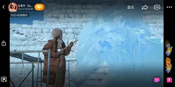 零下十几度的冰天雪地中,从画形、凿冰、雕刻,九月几乎都是独自进行。连续直播两天后,龙头便已初具雏形。据观测,2月22日和23日两天,其直播间累计场观超过3400万。通过直播雕冰龙的自证方式,九月不仅有力地回击了质疑,也让自己的实力和能力被更多人看见和认可,其账号也不出意外地收获了更多关注和喜爱。@黏苞米糊糊 :