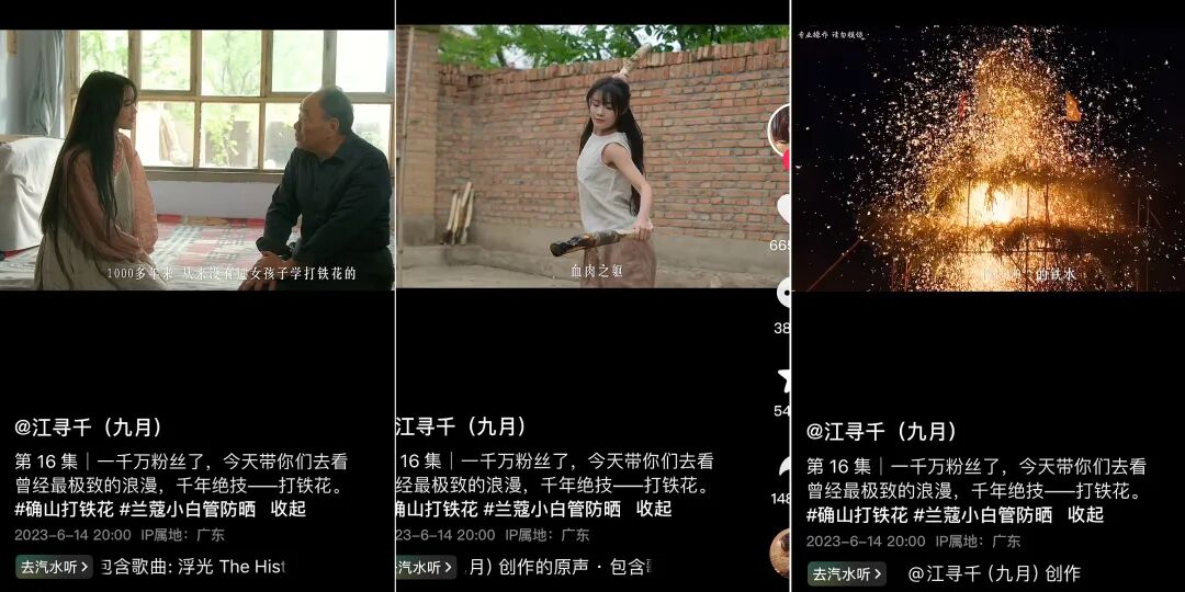去年6月,九月就曾凭借一条“打铁花”视频霸屏抖音、快手、B站等多个平台。“打铁花”是我国非物质文化遗产之一,表演者需要将1600度的铁水打向高空,铁水接触空气后急速冷却,化为漫天华彩,场面十分壮观。可惜的是,因为太过危险,掌握这项千年绝技的人已经不多,再加上男女体力上的差异,所以自古以来都是男性在学习表演。而为了传承这项文化遗产,不认输的九月提着行李就找到了“确山打铁花”的代表性传承人杨建军拜师,在老师的教导下从打石块、打沙子、打清水一步步练起,埋头苦学一个多月,终于成为了一千多年来第一个表演打铁花的女生。视频记录下的完整过程让众多用户震撼不已,账号也由此迎来了涨粉高峰。今年2月,九月之所以再次迎来涨粉高峰,源于她在直播间现场雕冰龙,以此回应网友质疑。