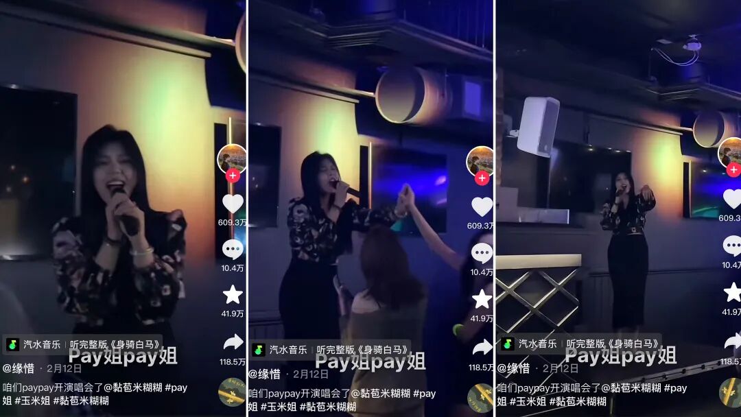 在这条视频受到广发关注后,视频中的主人公@黏苞米糊糊 借此成为焦点,其在2月23日发布的同首歌曲演唱视频获赞418.6W,账号也在2月涨粉百万,截至发稿时,粉丝量为591.9W。 @黏苞米糊糊 抖音视频截图事实上,在凭借这首《身骑白马dj》被更多人熟知之前,@黏苞米糊糊 已经凭借独特的视频风格和个人魅力吸引了不少用户的喜爱。在我们看来,@黏苞米糊糊 的账号可以类比为一个极度真实、极度接地气、内容又极其多样的大型朋友圈。由于曾在视频中认真分享过自己放pay(屁)的趣事, @黏苞米糊糊 被很多网友称为“pay姐”。pay姐是一名留学生,和自己的男友张鼎一起在英国留学,而她的视频便记录了自己留学生活的点点滴滴:和男友的趣味日常、生活吐槽、生活小感悟、穿搭、化妆、唱歌、和朋友聚会、上课……
