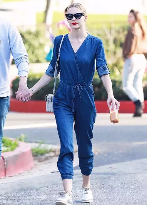 ▲丹宁V领连体裤+运动鞋,美式休闲风格尽显,收腰缩腿的款式让你看上去更显瘦,谁说烈焰红唇、猫眼墨镜不能与运动风结合,你看他们“相处”的多好。
