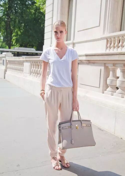 ▲白色×裸色的组合清爽十足,将上衣塞进裤子中时髦又干练,平底鞋让你舒适自在、高跟鞋尽显OL范儿。