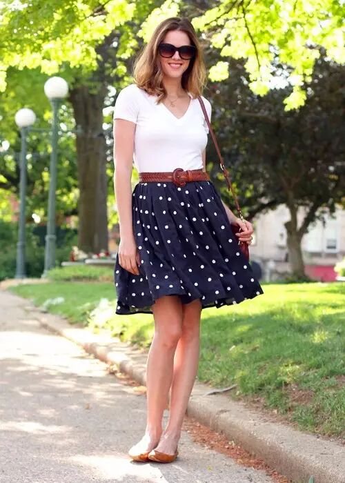 ▲白色V领T恤×波点短裙,不费吹灰之力轻松打造可爱甜美的造型,要显腰身就加条腰带,平底鞋让你出街更舒适。