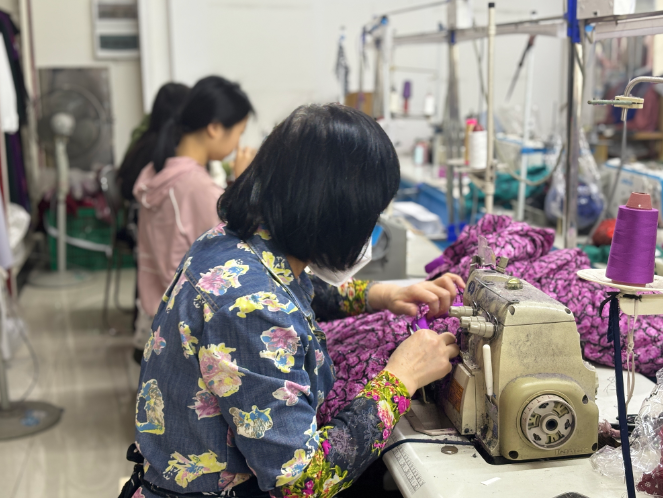 位于市区东风三路某家服装生产企业的门店内,圆领设计旗袍、盘扣中式马甲、水墨印花连衣裙等“新中式”服装十分吸睛;走进制衣间,几名服装设计师、制版师正在交流“新中式”服装的新款式,反复打磨服装设计细节。