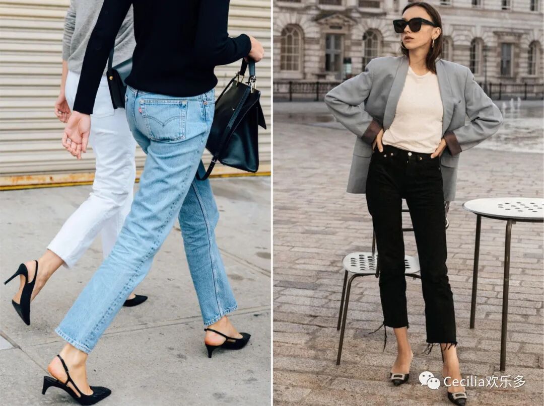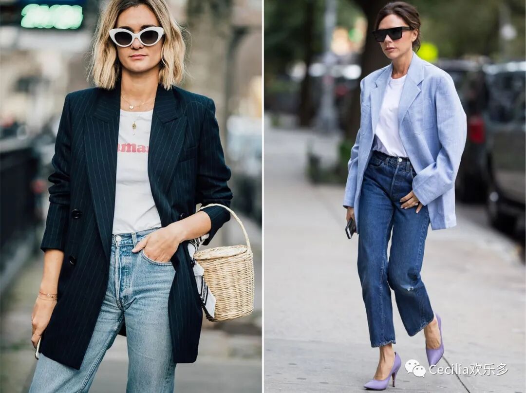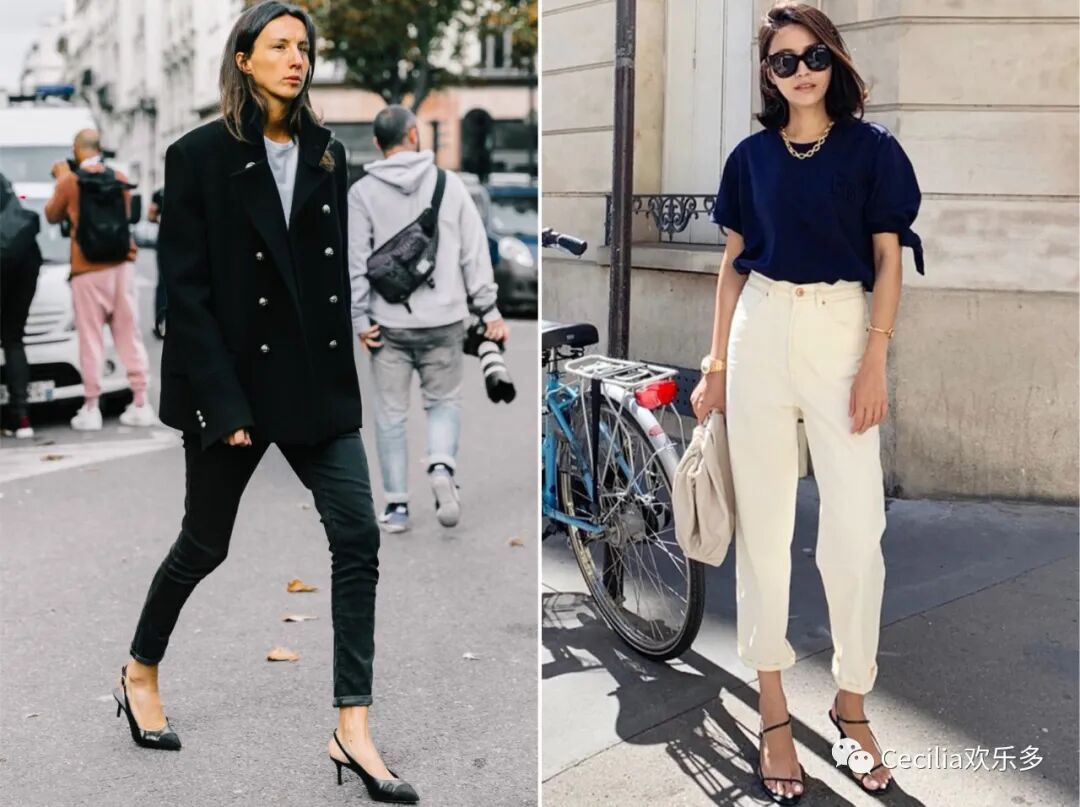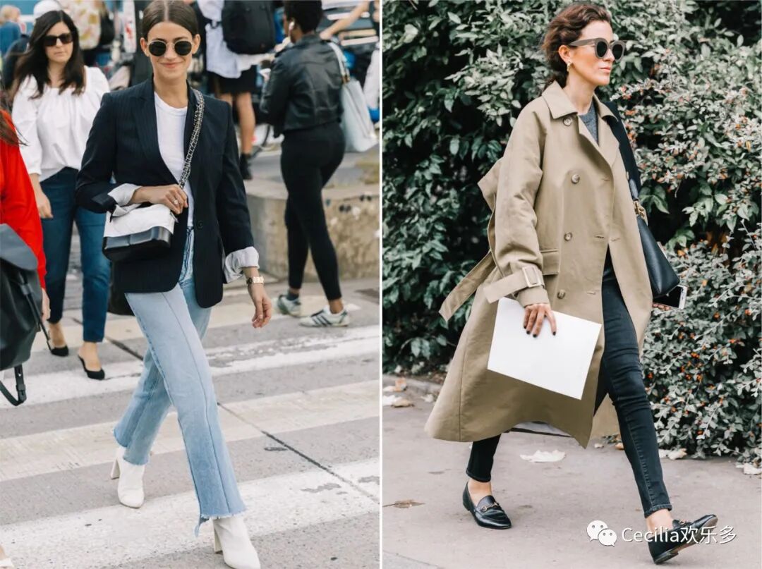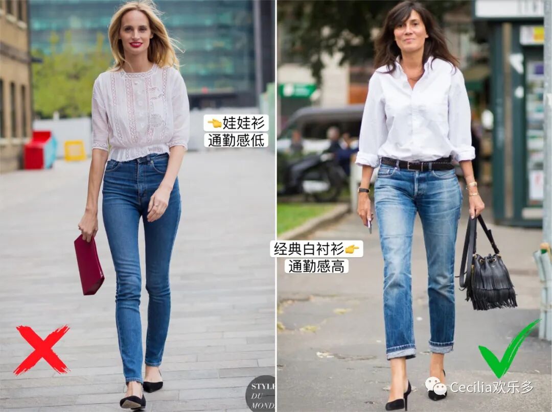 第一招是从法国时尚主编们街拍中学到的▼用水洗不明显的牛仔裤,替代通勤裤。