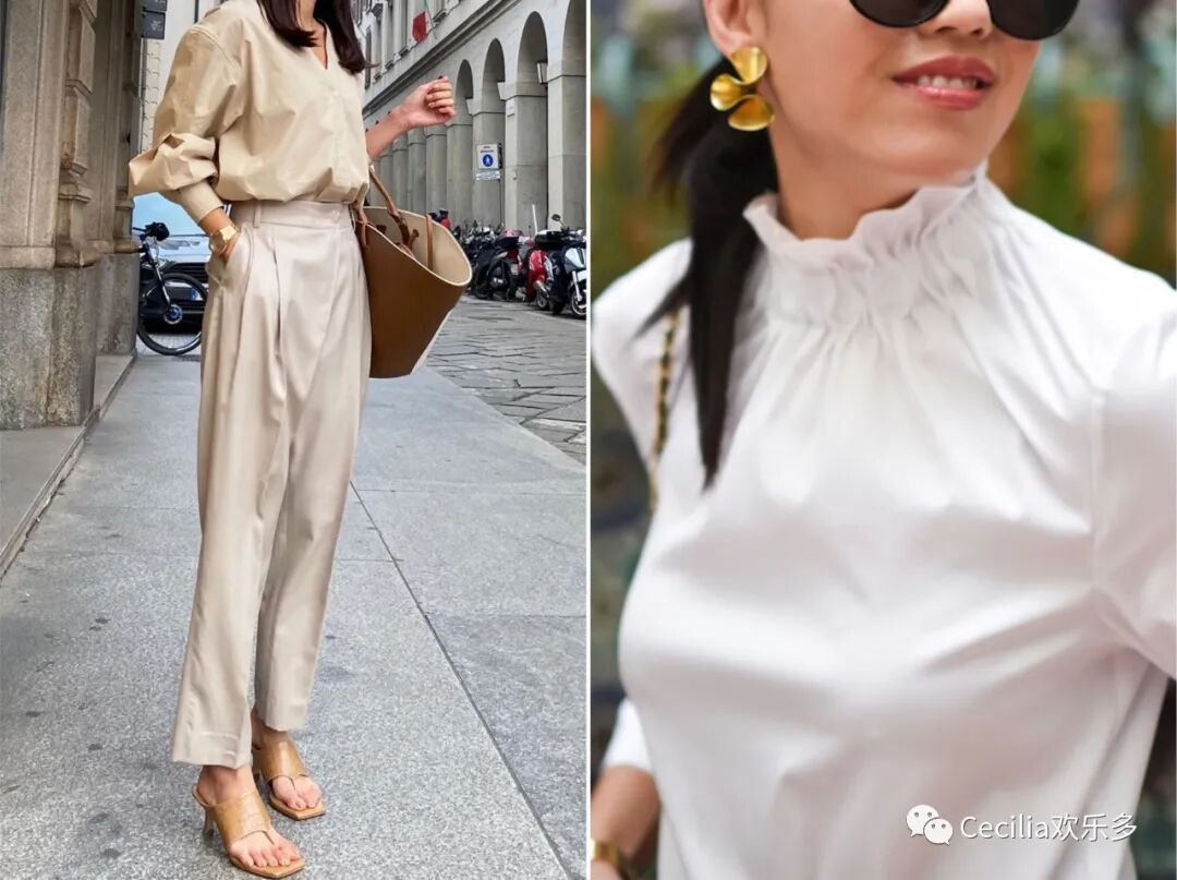 想带一点设计感和女人味,就选不夸张的羊腿袖或极少量荷叶边点缀的衬衫,避免大面积花边和蕾丝拼接,总体依旧保持利落清爽。
