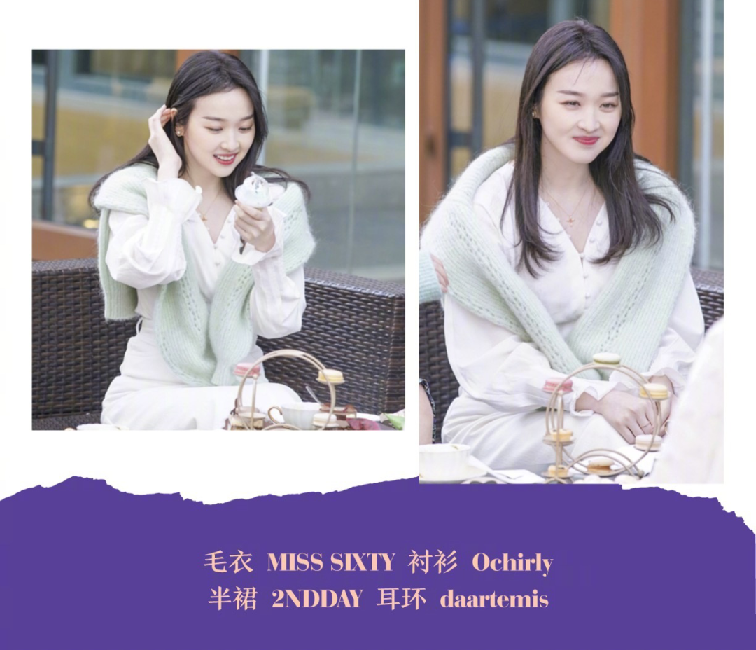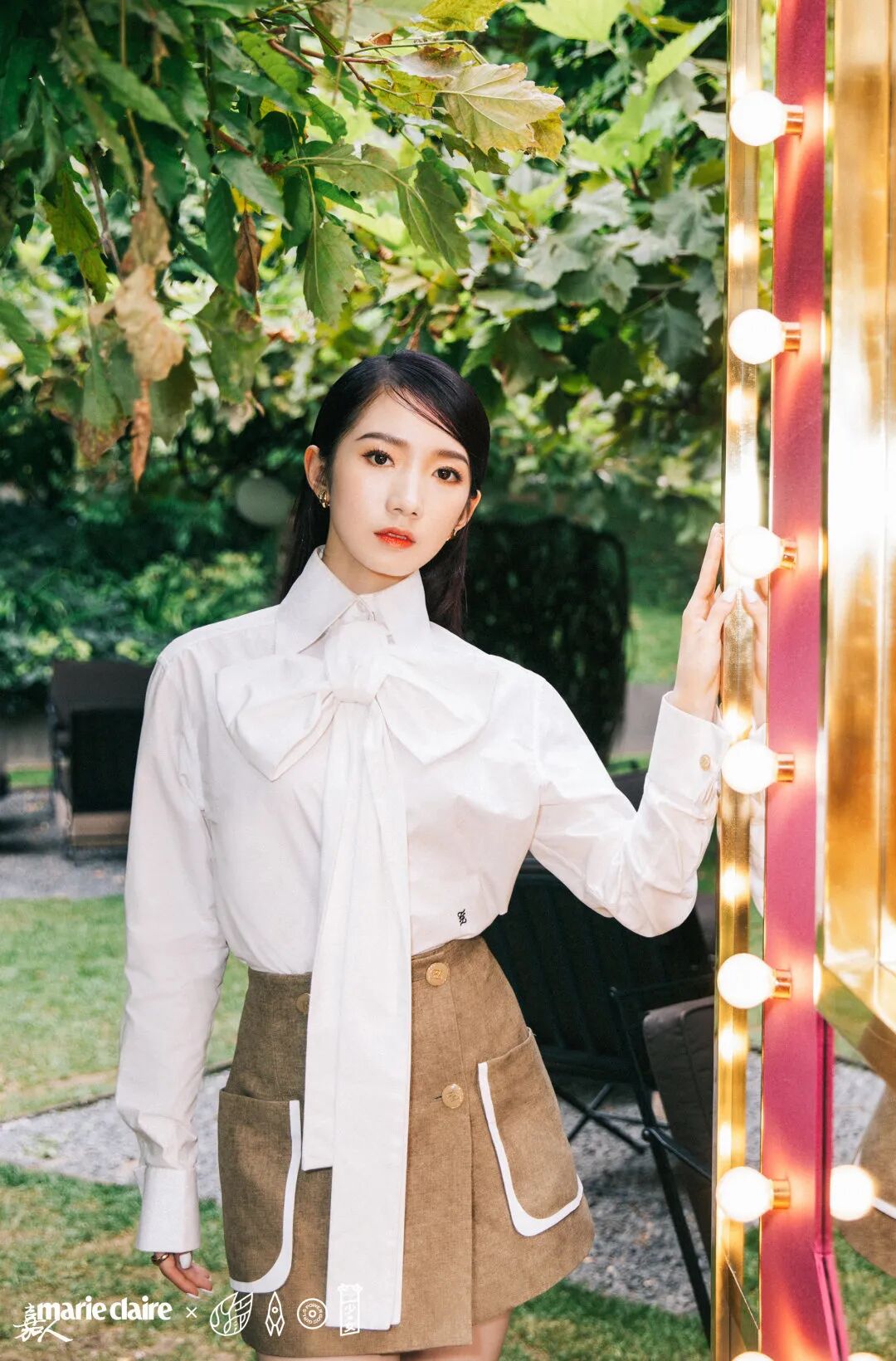 孟美岐的蝴蝶结白衬衫,搭配优雅明边小裙子,演绎法式风情。