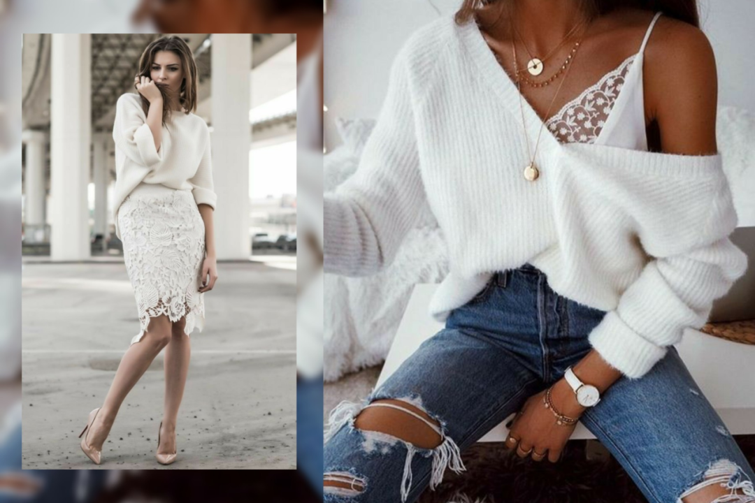 白色蕾丝内搭,优雅OL的绝配。无论是配上裸色的细高跟,还是垮型的浅色毛衣,都能给人一种随和的感觉。