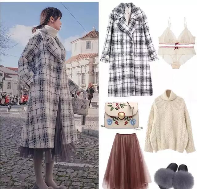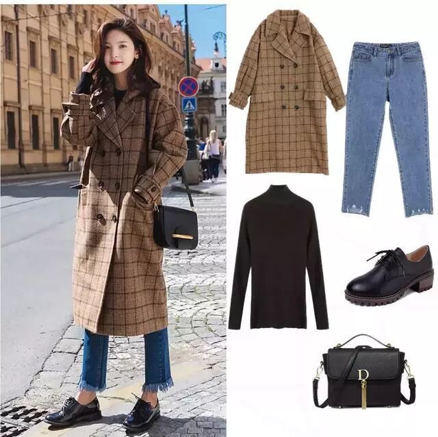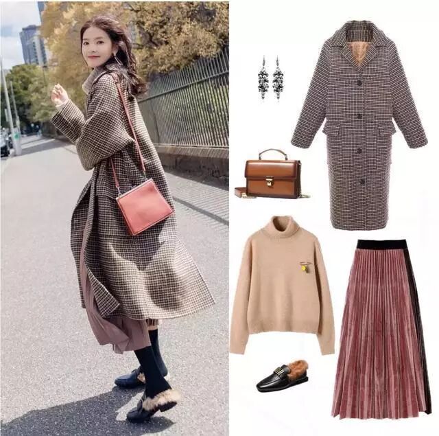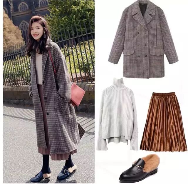 格子的大衣在设计上市比较宽松廓形的款式,这样的韩版相对而言会更加的遮肉,而且宽松的款式比起修身的更加的洋气一些,可以搭配一件高领的大衣毛衣,一条百褶裙,冷的时候穿上一条黑色的打底袜,一双黑色的带毛单鞋,一身的搭配保暖又好看。