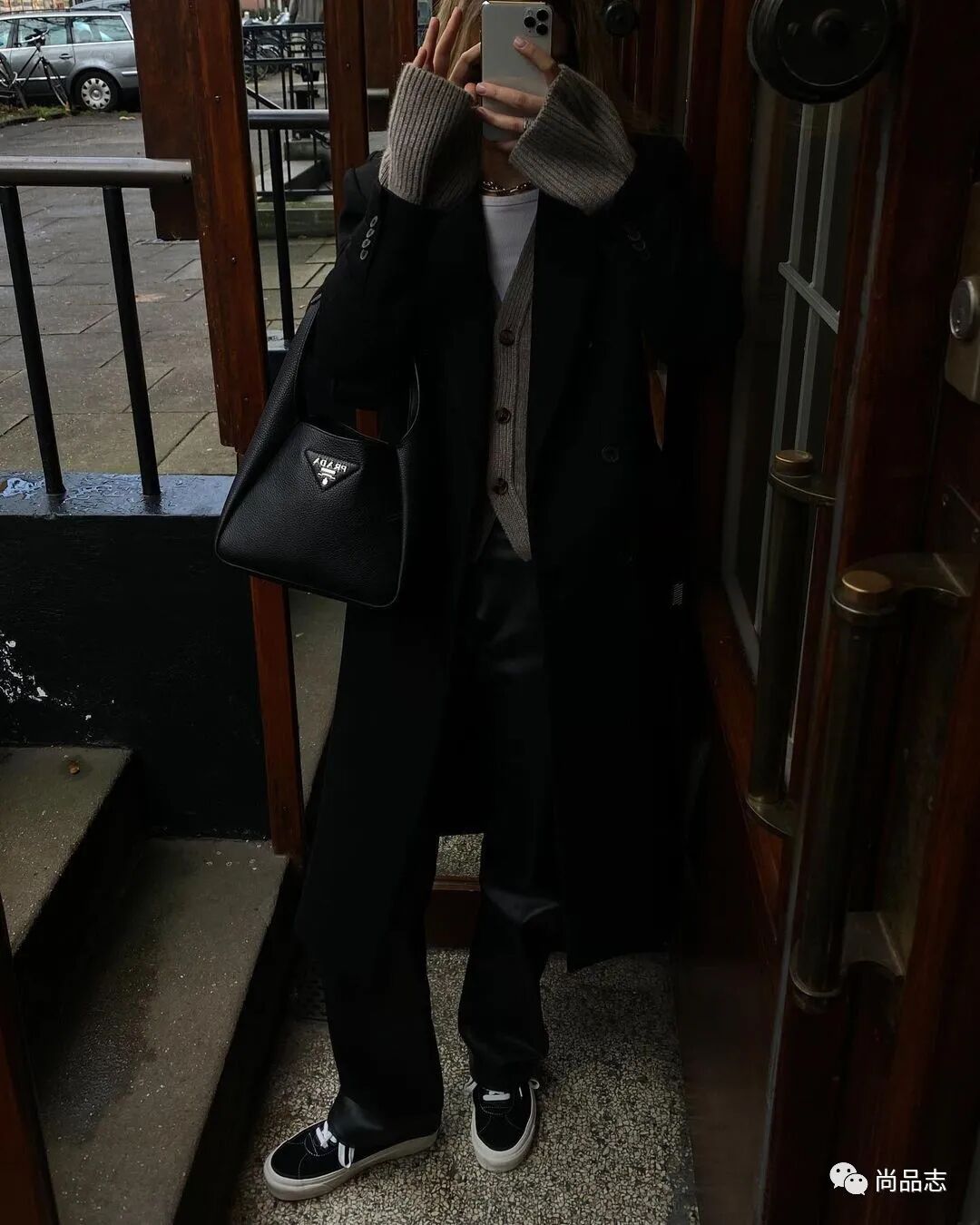 搭配法则里还有一条就是内搭的针织衫可以把长长的袖子露出外套袖口一截,特别有那种不经意间的慵懒时髦范儿。