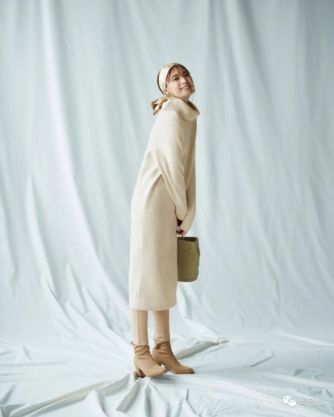 针织连衣裙作为毛衣的加长版,里面配上打底裤和踝靴,基本全身上下都裹的严严实实的,外搭长款冬天外套,怎么还会冷呢~