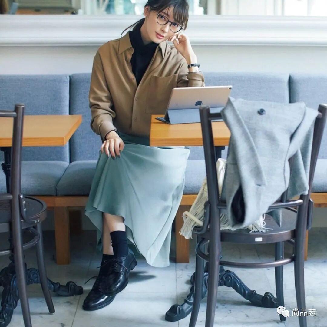想要通勤的时候让裙子更显正式一点,上半身用高领毛衣+衬衫的组合。