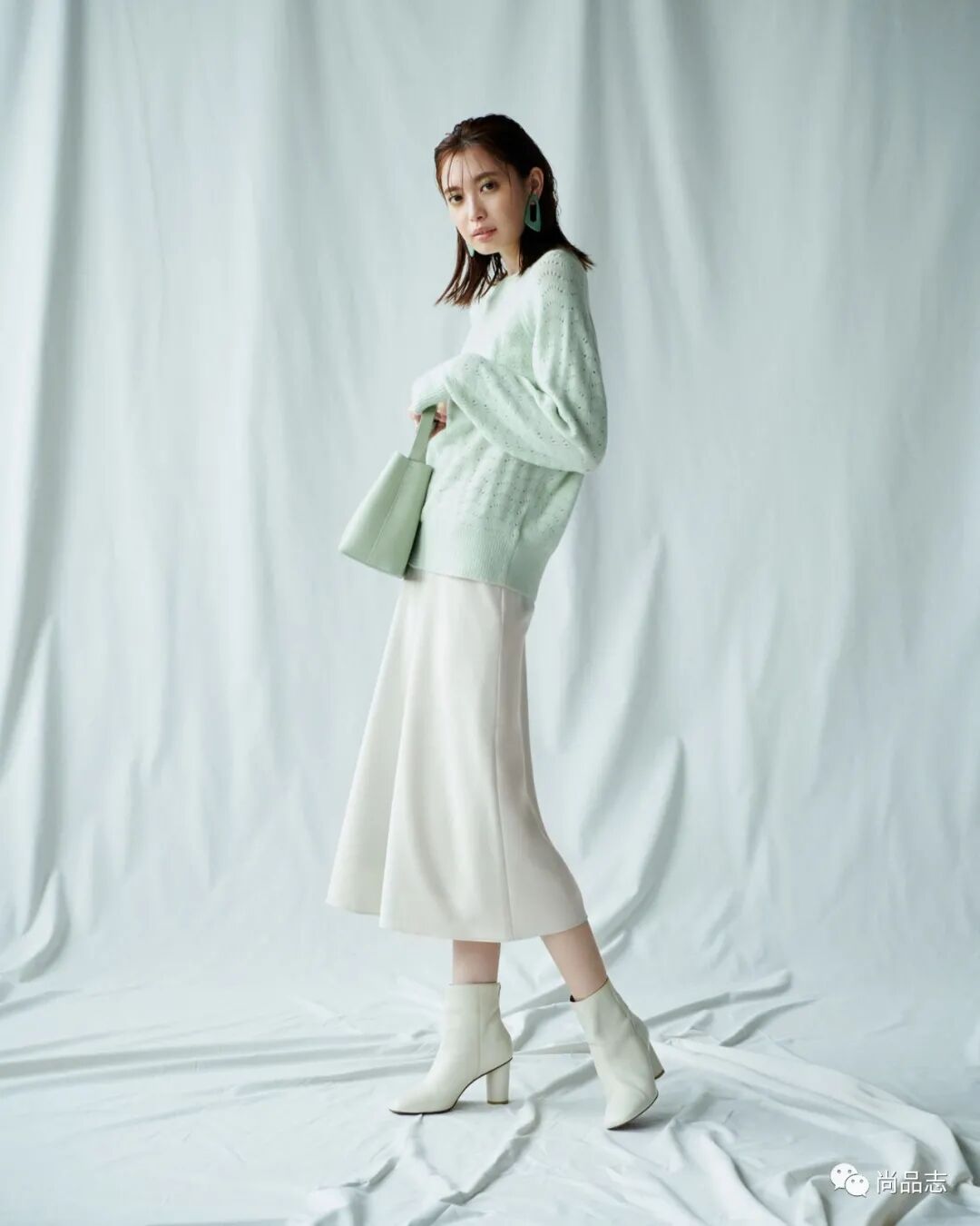我觉得冬天点缀一点彩色很有看头。比如这套在白色系列里面加入一点绿色,是不是比全白色耐看多了~