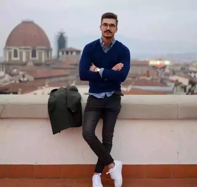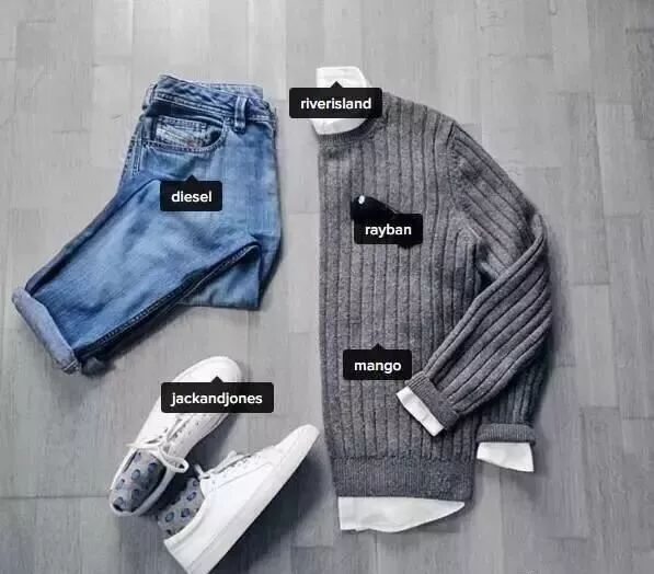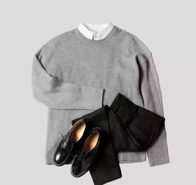 ▼进入社会想穿得稍微成熟一点的轻熟男可以选择灰色毛衣和白衬衫,搭配休闲西裤和皮鞋。