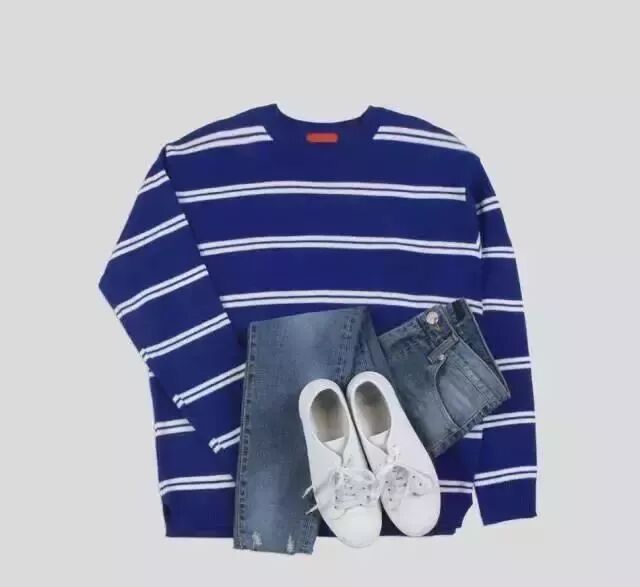 如果是年轻的学生党们可以选择蓝色条纹毛衣,搭配水洗修身牛仔裤和小白鞋。