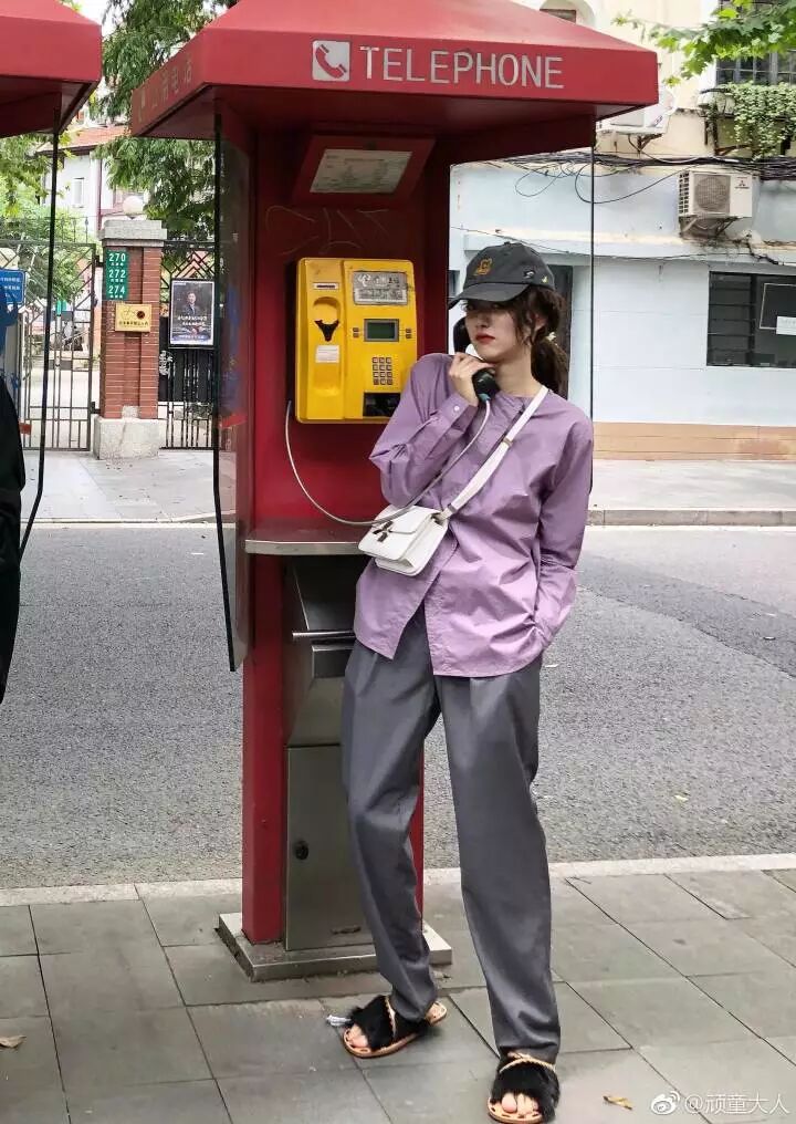 下图搭配的简单的衬衣,颜色选用紫色属于为同一明度的颜色,搭配白色包包如果换之以黑色则不会有同种的搭配视觉舒适感。