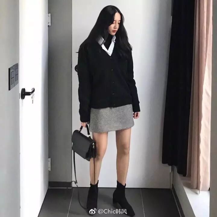 再如下图黑色毛衣白色衬衣,灰色短裙,冷淡风小性感。