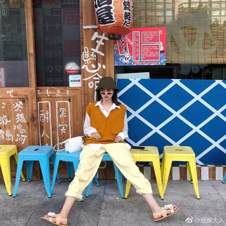 如图宽松型毛衣马甲搭配白色衬衣,浅色裤子卷边与浅色拖鞋,相互呼应,外加一顶黑色的渔夫帽休闲中又不会缺少酷酷的感觉。