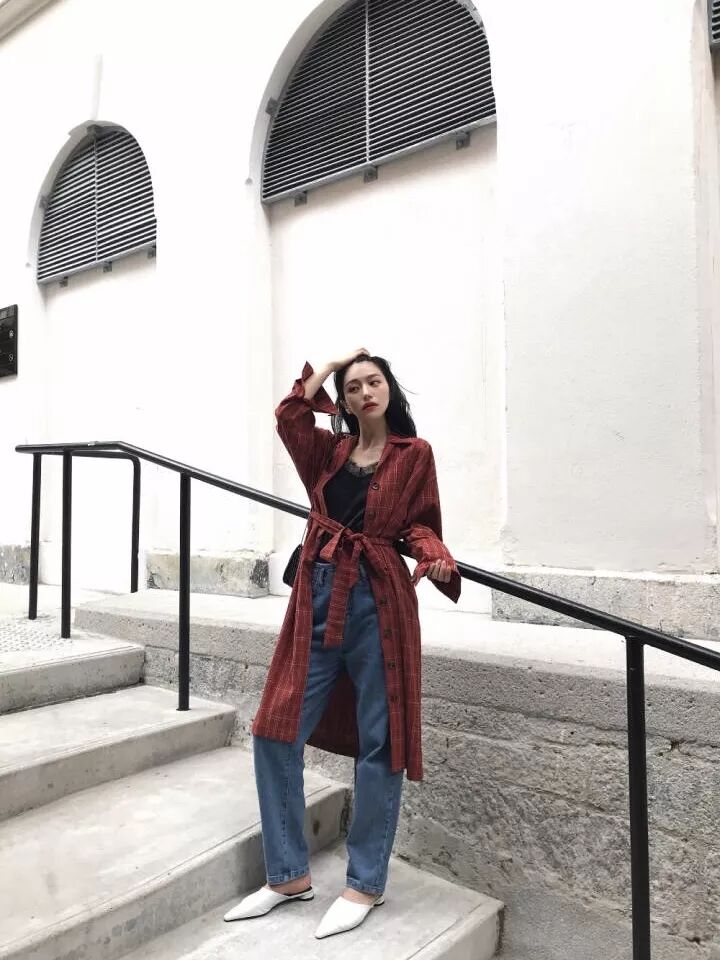 如下图,蕾丝吊带内穿,下身配牛仔宽松长裤,为了使的颜色搭配的好看作用的红蓝搭配,红色似睡衣版型的外套在充满设计感的同时有慵懒性感的感觉。