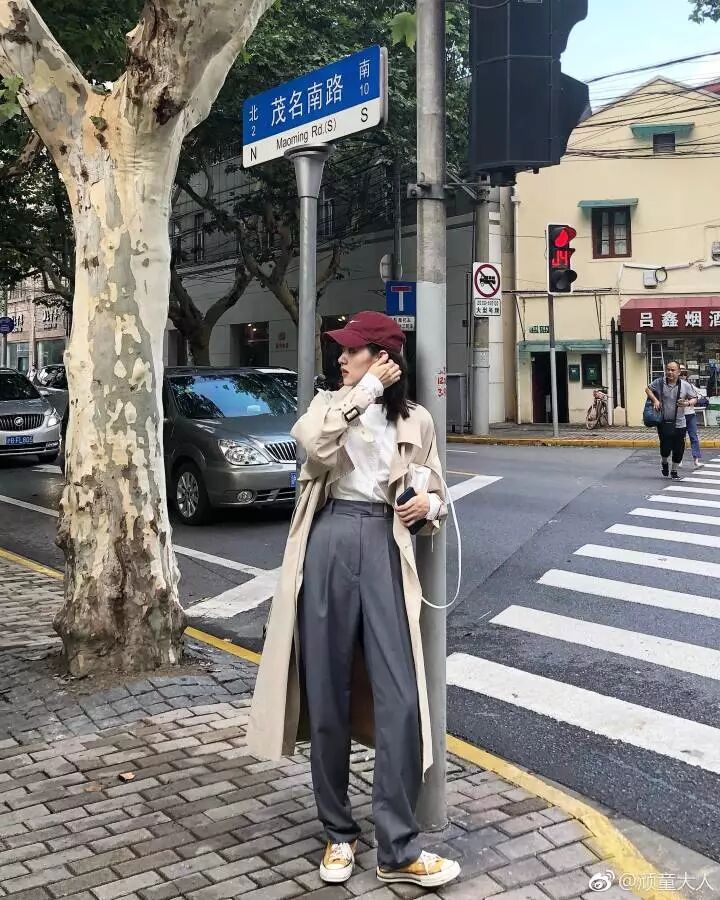 西装裤是流行后的必备搭配单品,如下图灰色西装裤,白色长袖打底,浅卡其色风衣外套,1970s黄色帆布鞋。