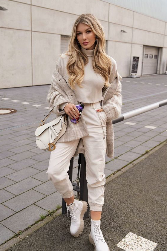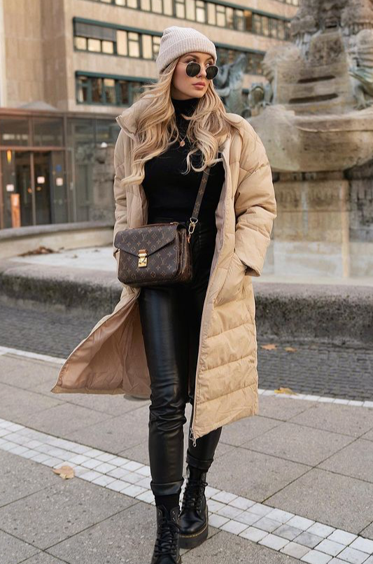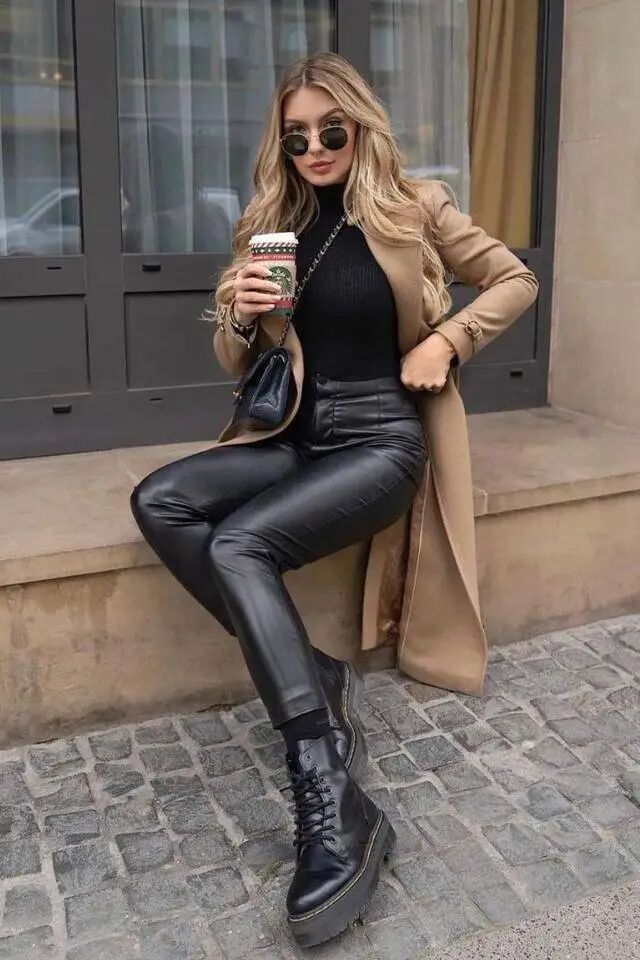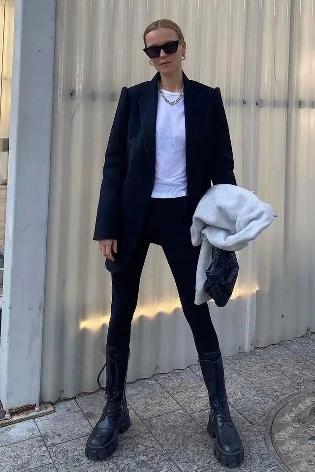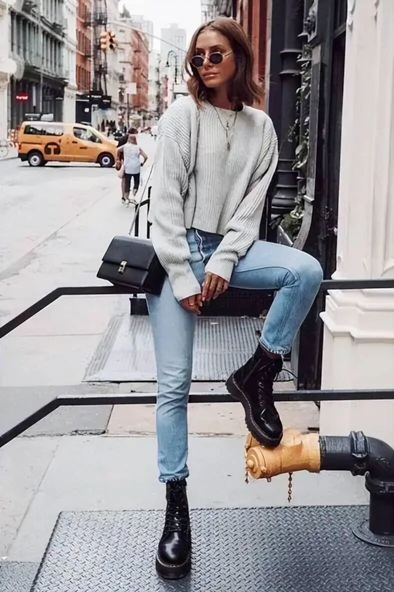 这种搭配不仅能够拉长腿部线条,还能在视觉上营造出更加修长的效果,显高显瘦。无论是紧身的牛仔裤还是轻薄的九分裤,小黑裤都能与马丁靴完美结合,打造出简约而有力量的都市感。