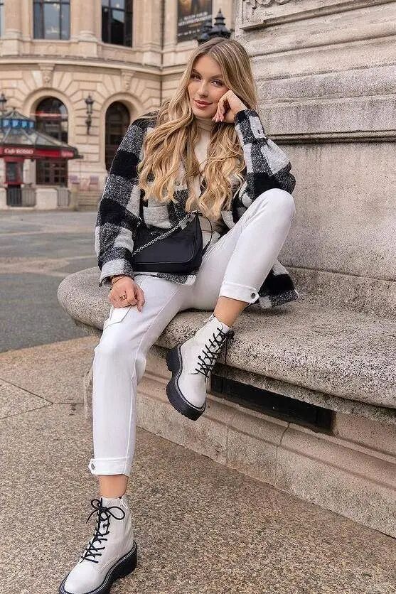 马丁靴与小黑裤的搭配还极具变化性和适应性。在春天,你可以选择一双带有装饰性细节的马丁靴,如金属扣环、亮色缝线等,为简约的小黑裤注入新的活力和趣味。