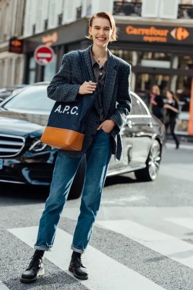 马丁靴搭配牛仔裤,是春天街头风尚中的经典组合,凭借它们的多样性和适应性,为日常穿搭注入了一份随性而不失格调的时尚感。