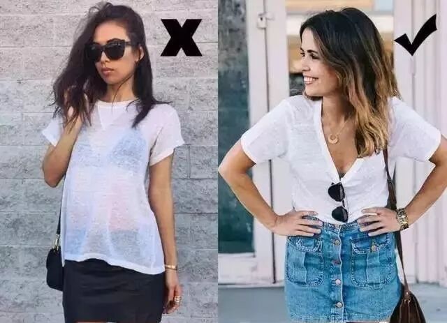 不要选过于薄透的材质,别以为透出的内衣和肉是性感,其实更容易暴露T恤的廉价感。最好挑选摸起来比较柔软但是面料有型的材质,看起来会有质感很多。