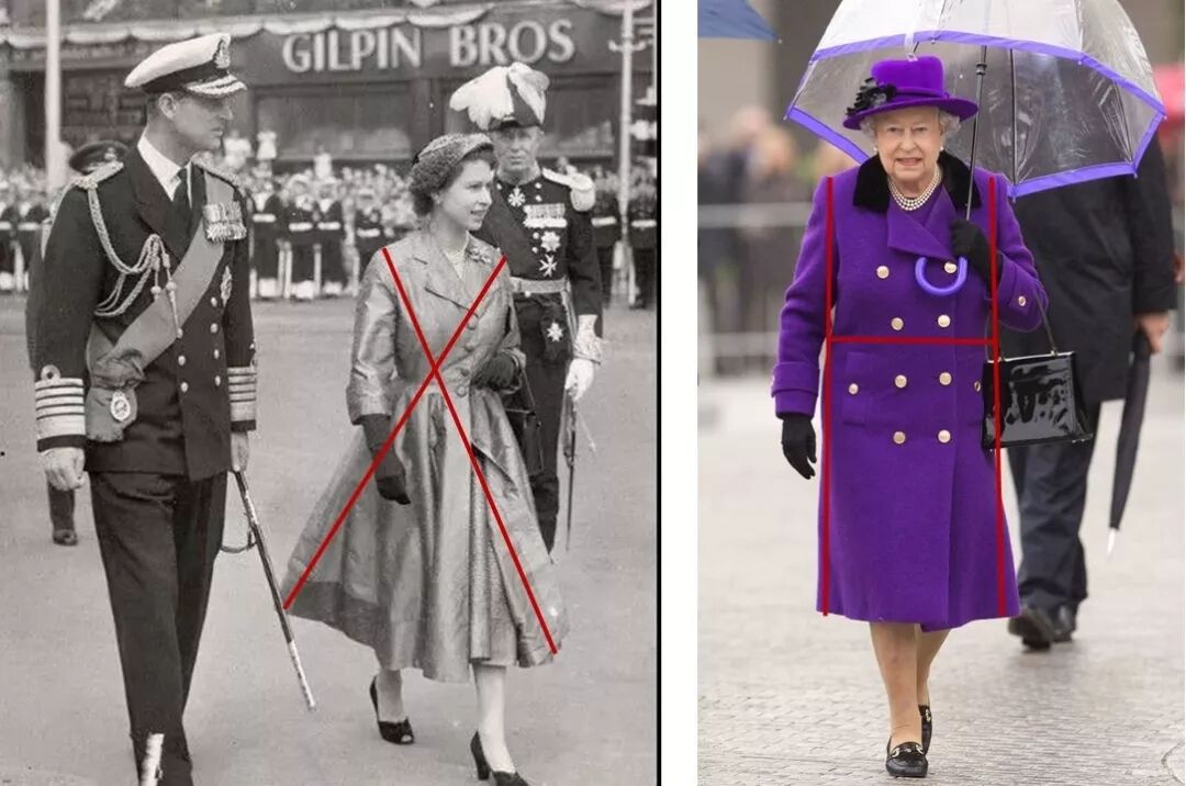除了颜色和配饰的搭配,对于衣服本身款式的选择也很重要。女王年轻时喜欢X型的连衣裙和大衣,而现在大多穿H型的。