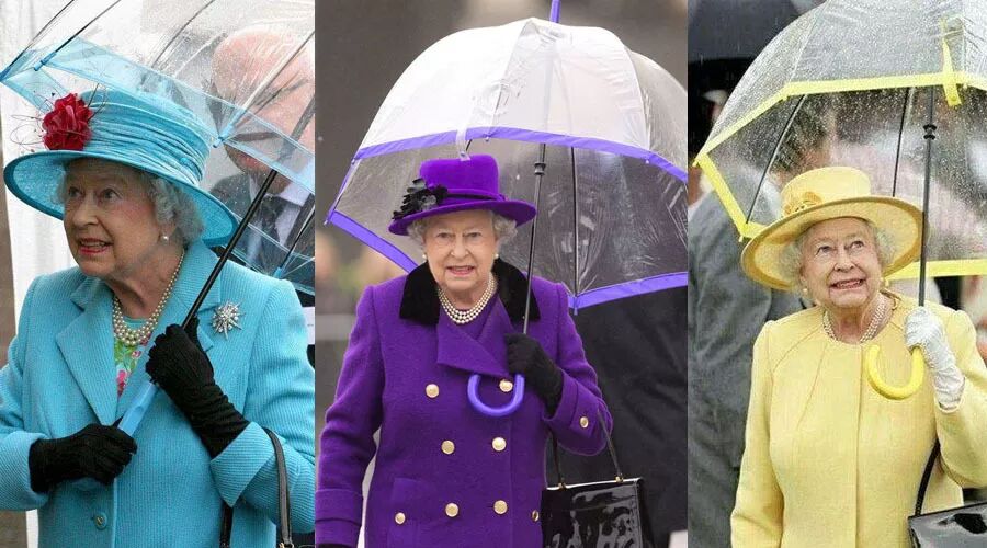 不仅如此,女王每一把伞也都是有小心机的。女王为了让所有人都能清楚地看到她,每次带的伞都是透明的,而伞边的颜色必定和身上的主色调是一致的