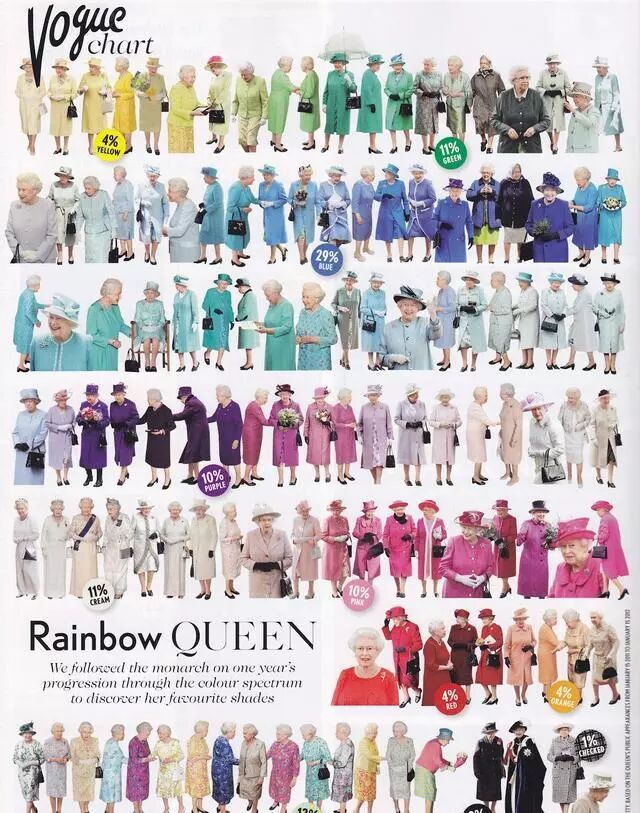 这种纯色的搭配女王一穿就穿了几十年,一点都不过时。时尚杂志Vogue甚至为女王的穿搭做了统计分析,看看下图就知道女王有多热衷这种搭配了。