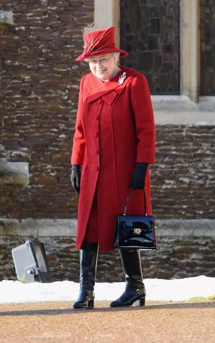 如下图,女王从年轻时就喜欢这种纯色系的长款大衣,颜色上大衣、帽子、帽子上的羽毛都保持同色系,同时搭配黑色的手提包、手套、长筒靴,整体红+黑两个颜色,造型简单大方。
