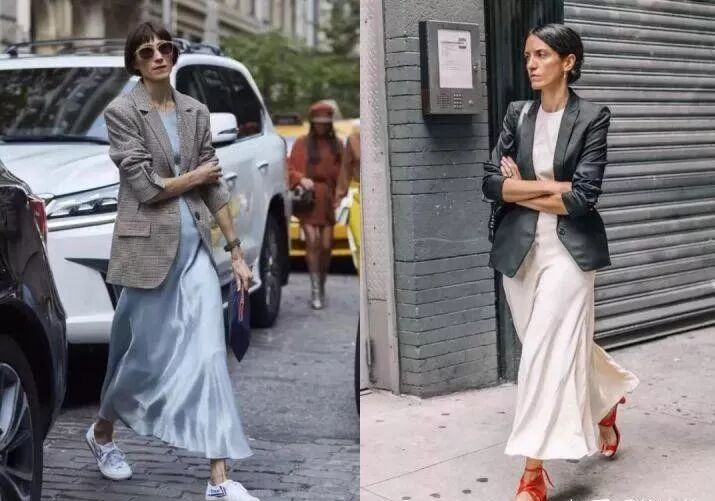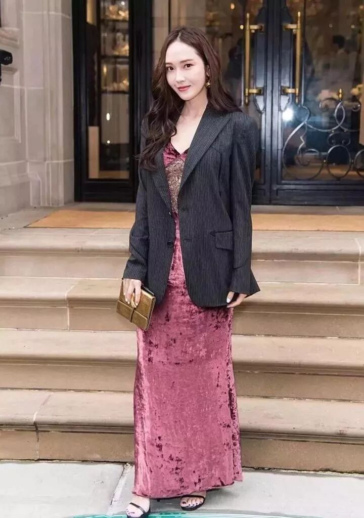 Tips2:日常穿西装款式不要一穿就变工服,一穿变呆板,日常的妹子们的休闲西装一定要把握住娘man平衡的原则。因此与西装搭配的连衣裙,最好是各种极富女人味的材质,同时还得是端庄的中长款。