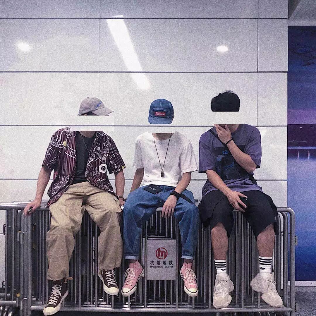 第一眼看上去就知道三位选手都是穿搭老江湖了。先来说说左边的帅气担当,港式工装风小哥哥,印花衬衣和阔腿工装裤,鞋子和衬衫颜色首尾呼应,整个搭配没有太过鲜艳的颜色,但整体看起来就是有味道!中间偏old school美潮的哥们也不愧是C位出道,为了使纯白的T看起来不那么单调,一条项链去做修饰是在好不过的选择,而用心之处在于看似不经意的挂在腰间的小挂袋,无形之中增加了搭配上的多样性,最后再来一双骚粉converse,给整个搭配带来了更多的活力,太会穿了吧!最后右手边的new school美潮也丝毫不逊色于其他两位,作为团队的低调担当可谓是当之无愧,虽说搭配上没有花衬衣和骚粉这些太过于张扬的操作,但是在单品的选择上细心地选手可以发现,不管是sup的挎包还是三叶草的小标袜子配yeezy,品牌文化的感染力,绝不会仅仅局限于风骚的颜色,毕竟搭配的精髓在于细节,或许这就是new school美潮应有的样子。身边能有两个这么会穿的好哥们也真是人生一大幸事。最后说句题外话啊,地铁站内部严禁肆意耍帅,谁要是在杭州地铁站碰到这三位,上去活捉个一半只的回来好吗,有奖励!