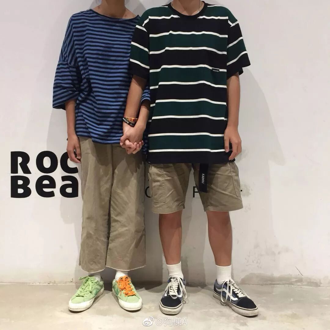 哎呦呦快看看这是谁来了,作为各大穿搭平台较为活跃的大佬之一,狗棟小哥也是再次登上我们的栏目,还是一如既往地狗棟标志性截头照,不同于以往的是小哥哥这次是带着女朋友一起来的哦,猛的一看这不是张志明和余春娇吗,哈哈哈哈是不是夸的有点过头了,言回正传,回归穿搭,这张的整体感觉的确还是偏港风的穿搭,经典的横条元素,卡其色的简约工装,纯白的复古老爹袜。我一直强调情侣装不一定款式要完全一样才算是情侣,那只是低端的“全员恶人”级别的low逼搭配,真正高端的情侣装在颜色款式上都不一样,但是却包含着相同的元素,狗棟夫妇这一身在情侣装的搭配诠释上就是一个很好的呈现,首先两人都是复古港风的style,风格统一;其次上衣的选择上包含了相同的元素,女生是偏细柔一些的蓝色横条,男生则是选择了相对大气张扬的黑绿横条;第三,同色不同款,在裤装上,女生喜好偏向于一条简约的阔腿工装长裤,而小哥哥则是选择了一条五分短裤,颜色当然都是经典的卡其色,虽然款式不同但是颜色上的统一还是让两人的搭配浑然一体、密不可分。这样两身行头走在街上,一定会是一对儿让大家都羡慕的情侣。什么都别说了,这碗狗粮,我先干为敬!