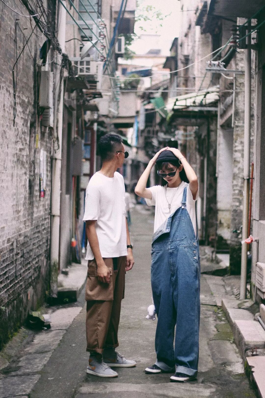真的是人帅不怕巷子深,这姐弟俩也太棒了吧,没有太过于复杂的配饰,但是整个搭配与背景完全融合,像是电影里截取的一帧画面,夕阳西下,断肠人在天涯。姐姐这身搭配丝毫不愧对于她清秀的脸颊,一身宽松舒适的大T恤和背带裤,更加凸显出娇小瘦弱的骨架,有意的将一侧背带自然下垂,无形之中增加了搭配上的多样性和创意。再来说说弟弟,搭配上也是极简尽奢华,亮点在于这条质感十足的卡其色长裤,多口袋的设计给裤子带来更多的层次感,质感上却是偏西装裤的面料,区别于普通的港式工装裤,给整个搭配带来不一样的味道。值得一提的是这姐弟俩玩转搭配的同时也不忘自己设计衣服,创立了他们自己的品牌Yellow·dog,将自己对穿搭的理解和想法融入设计。希望姐弟俩未来也能不忘初心,认真穿衣的同时将更多的创意和灵感带给大家。