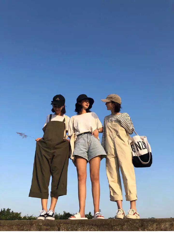 晴空万里,闺蜜出动!抓住夏天的尾巴最后秀一波,夏末初秋教科书般的穿搭。左边小姐姐的鸭舌帽加背带裤清新又可爱,俏皮又防晒,搭配一双vans出街没毛病,手里还调皮的拿着一根小草,低着头偷偷地抿嘴笑也被我发现了哦