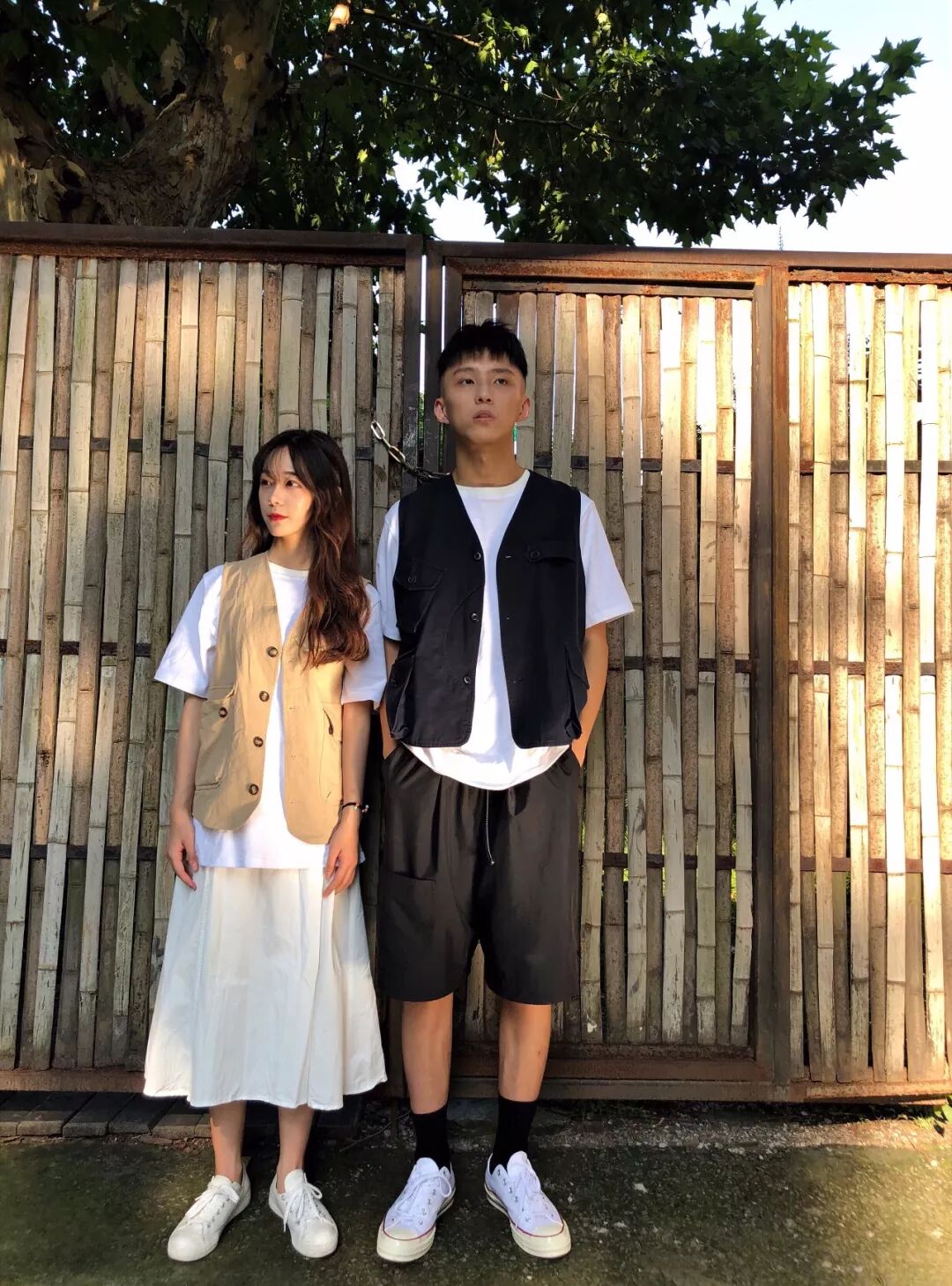 不得不说啊,单从画风上看真的有被暖到。两人在搭配的选择上也很干净清新,个人认为,鉴别一套成功搭配的条件之一就在于能否给自己营造一个全新的人设和形象,而这对cp的邻家小妹和阳光男孩的既视感我想我也不用多说了吧。小姐姐娇小瘦弱的骨架在男搭档身高的衬托下显得可爱又小只,日系工装马甲搭配过膝裙和小白鞋,真是随随便便就能美哭100个屏幕前的宅男们。再说说小哥哥的搭配吧,白色打底T恤和马甲在长度上的参差不齐营造出搭配上的层次感,裤装的选择也是版型很宽松慵懒的CELL AGING,这个牌子在前面的栏目里我不介绍过不止一次,也是近期国潮里的清流之一,与其重复介绍不如说说小哥哥和小姐姐用来打底的这件短袖,SAuidetails可能一些选手还不知道,我也是在小姐姐这里了解到,这是她们做的自主品牌,短袖的后方还有专门设计的印花,总之用心做事儿的人运气不会太差,希望你们未来能好。最后也来个彩蛋吧,其实这对cp真的也仅仅是cp,真正的爱人藏在镜头后哦。
