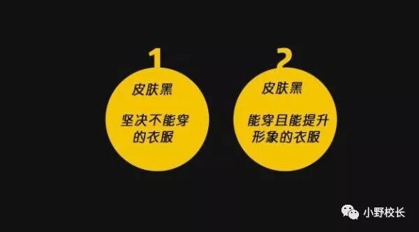 那么,肤色黑应该穿什么颜色?校长教你七招建议一:“黑白经典两色”皮肤黑就要穿黑色、白色啊是永远的主调(如下图)